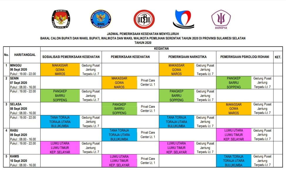 Dihari pertama pasangan calon dari tiga daerah yakni Makassar Gowa dan Maros yang akan menjalani pemeriksaan kesehatan, di hari kedua pasangan calon dari Kabupaten Pangkep, Barru, Soppeng, di hari ketiga Tana Toraja, Toraja Utara dan Bulukumba serta di hari terakhir, Luwu Utara, Luwu Timur dan Selayar