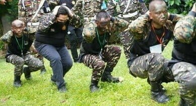 Erick tampak melakukan jalan jongkok hingga merapat di atas tanah saat mengikuti rangkaian pendidikan Banser.