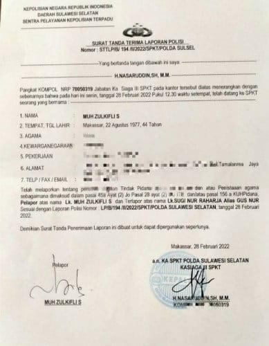 Hal itu menurut Zulkifli merupakan bentuk penistaan agama sehingga dirinya mengajukan Laporkan Polisi (LP) terhadap Gus Nur ke Mapolda Sulsel, Senin (28/2/2022).