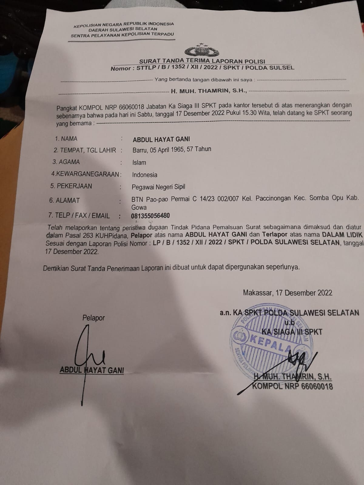 Didampingi Kuasa Hukumnya Abdul Hayat Gani, melaporkan dugaa tindak pidana pemalsuan surat Dengan nomor Laporan, STTLB/B/1352/XII/2022/SPKT/Polda Sulsel